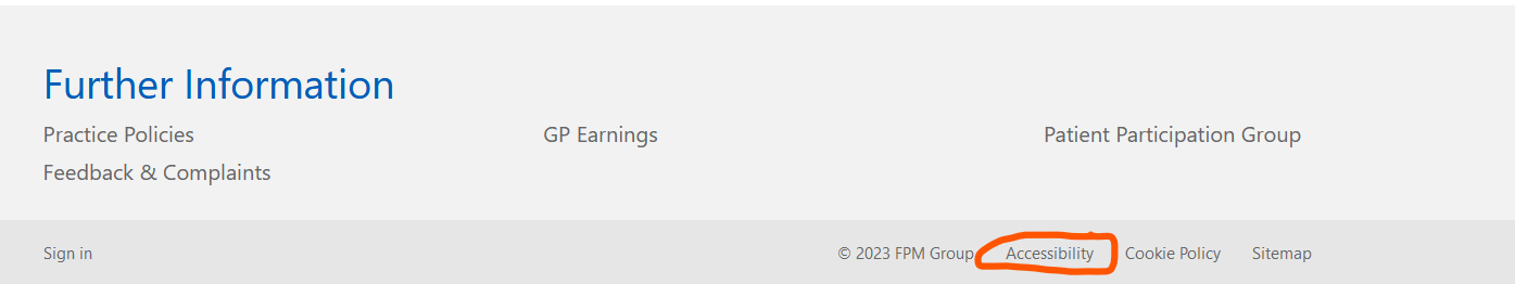 - Your website contains by default an Accessibility statement. This relates to the features built into My Surgery Websites and is not editable. You can access this at any time via the link in the website footer.