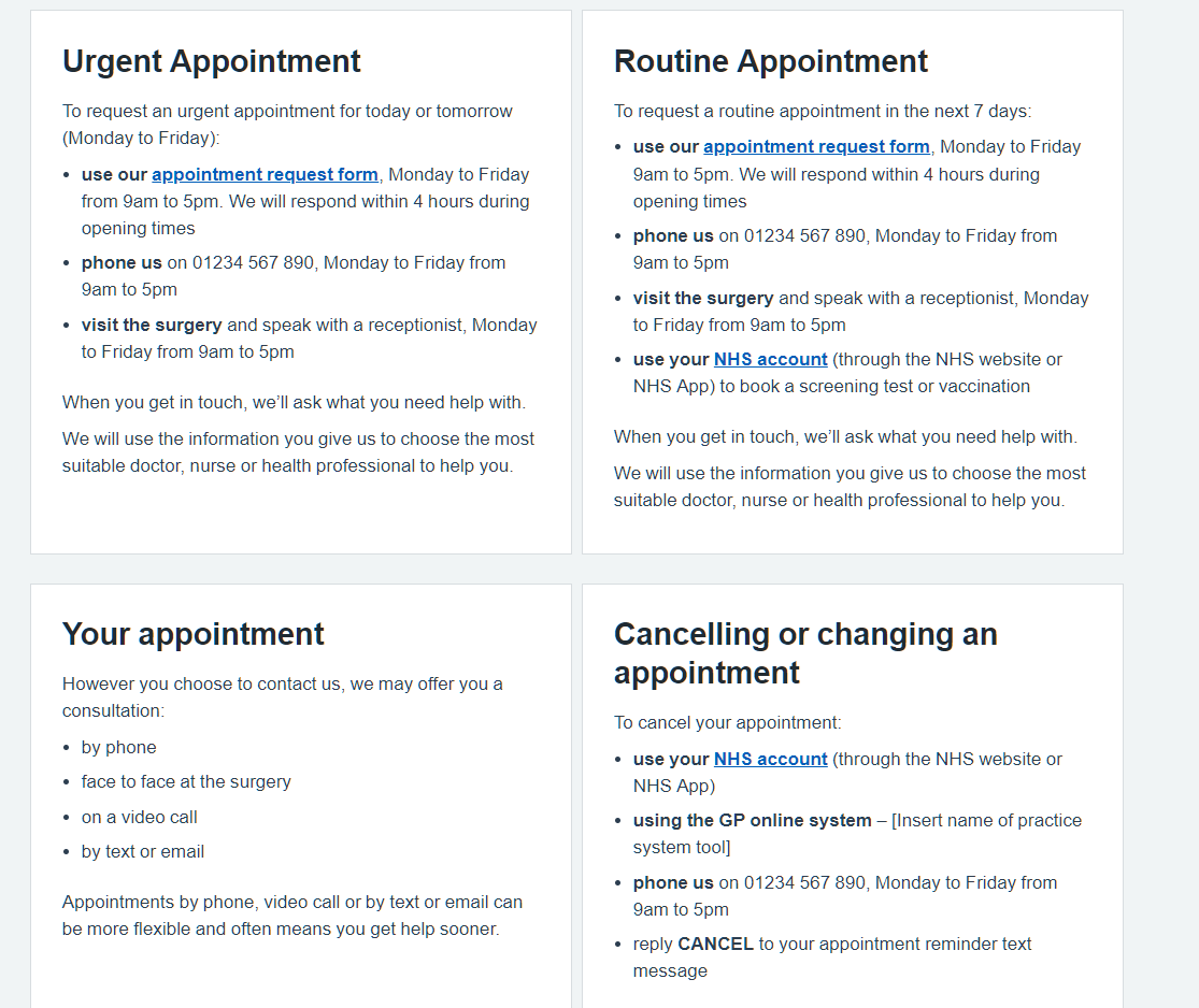 An appointments page with a clearly labelled section headed 'urgent appointments'. A clearly written explanation of all options available and how to access them. Information should also include extended access options available to patients.