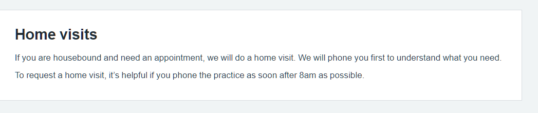 Clear information on the Appointments page about when the practice will do home visits and how to request one.