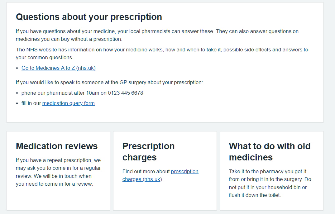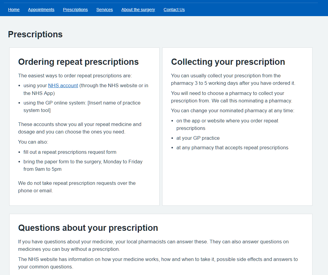 Content on the prescriptions page is well structured (with clear headings and short paragraphs) - Well