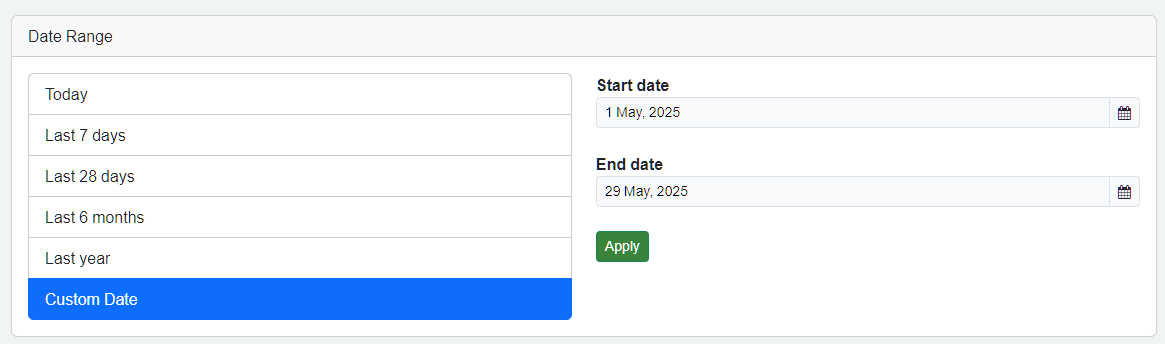 When selecting the "Custom Date" range option, simply enter your desired start and end dates, then click "Apply" to view the data for that specific period.