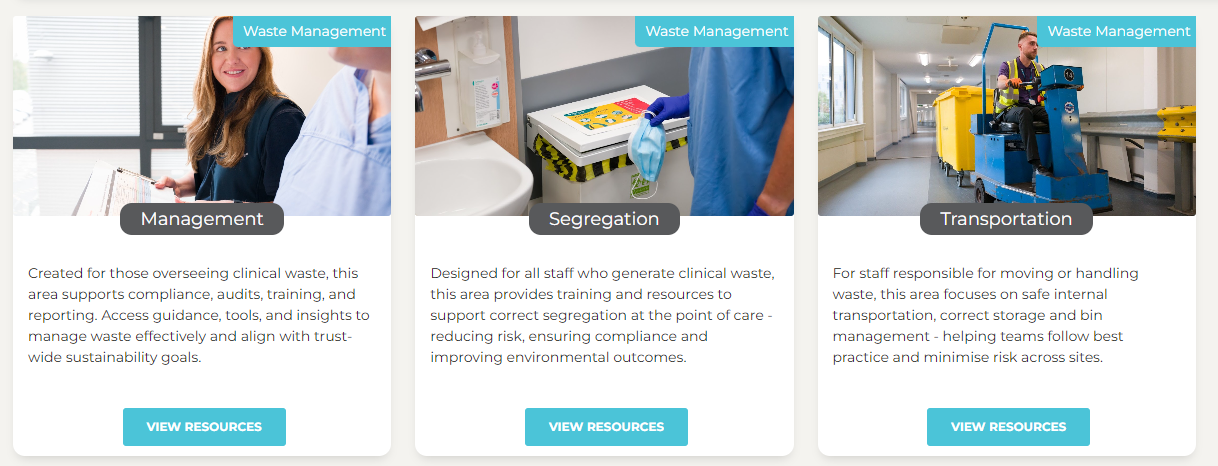 The Resources section is where you can preview, download and watch resources. The resources cover a range of topics, including Waste Management, Segregation and Transportation.