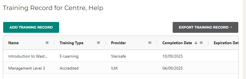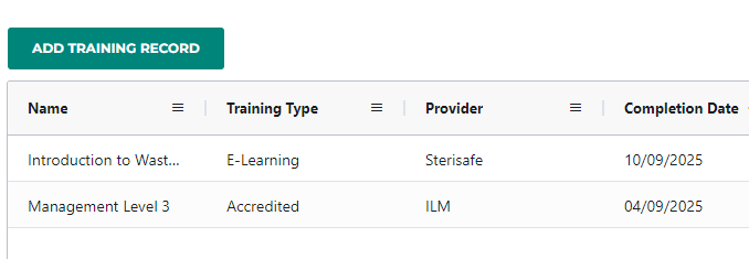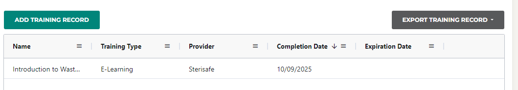 Stericycle Learning Centre allows you to add any additional records via the Add Training Record button: