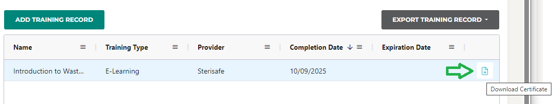 To download a certificate, hover over a training record and select the "Download Certificate" button on the right: