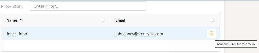 Within the Group management page, hover over a staff member, and select the bin icon to remove the user from the group: