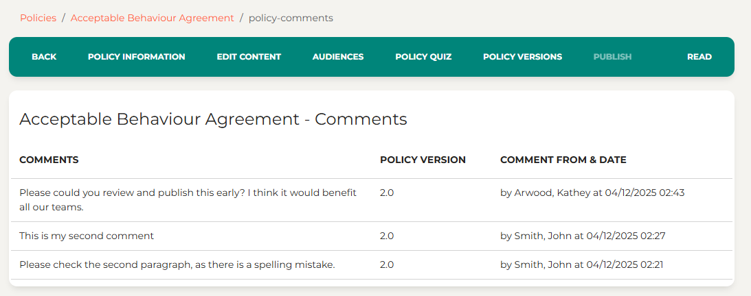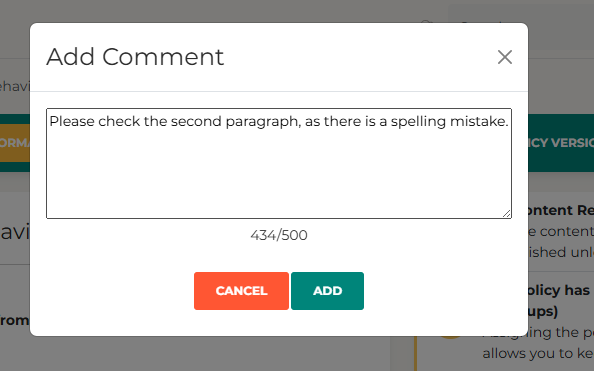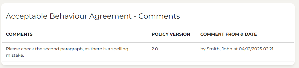 You might use this feature to flag something for the Policy Owner, such as “There is an error in paragraph three” or “Please review the final section before the next publish”.