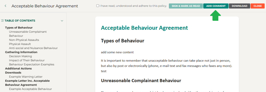 Staff who are not responsible for managing policies will not see the Add Comment button from their Reader screen, as seen below.