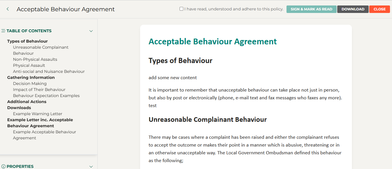 In the example below, I will navigate to the "Acceptable Behaviour Agreement" policy information page: