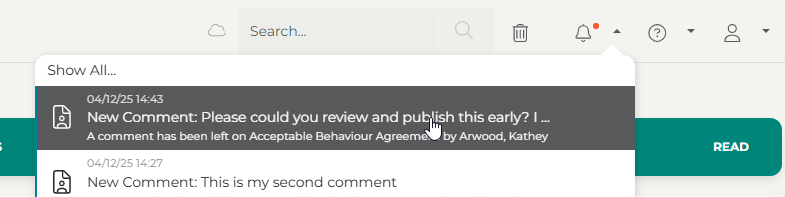 Notifications will appear in your profile if a comment is made on a policy: