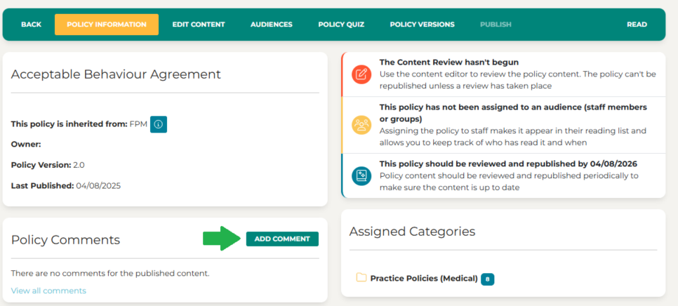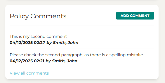 Published policies now include a Policy Comments section on the Policy Information page. This allows staff who are responsible for managing policies to add notes or feedback.