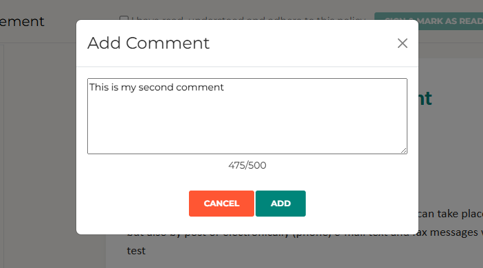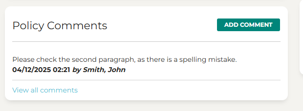 For example, you may have a policy assigned to you, but you spot an error or an adjustment that needs to be made. You can press the Add Comment button, which will add the comment to the Policy Information Page.