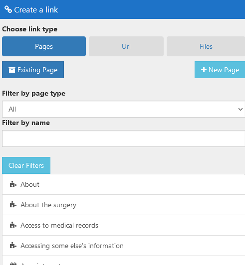 - Click the “Add a link to this widget” button to add a link that will appear at the bottom of the information box. The link selector will appear in the side bar.
