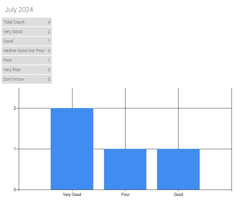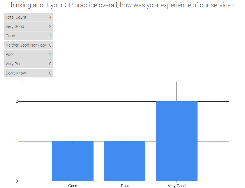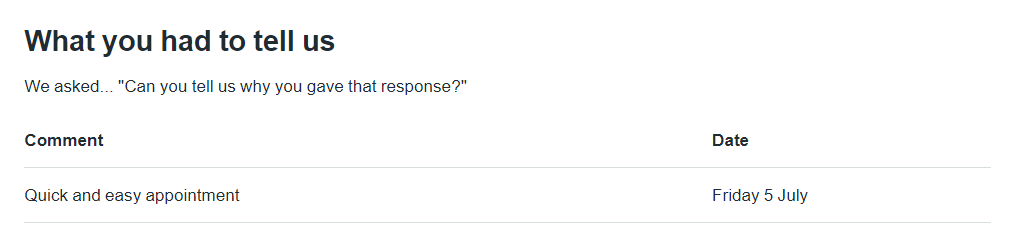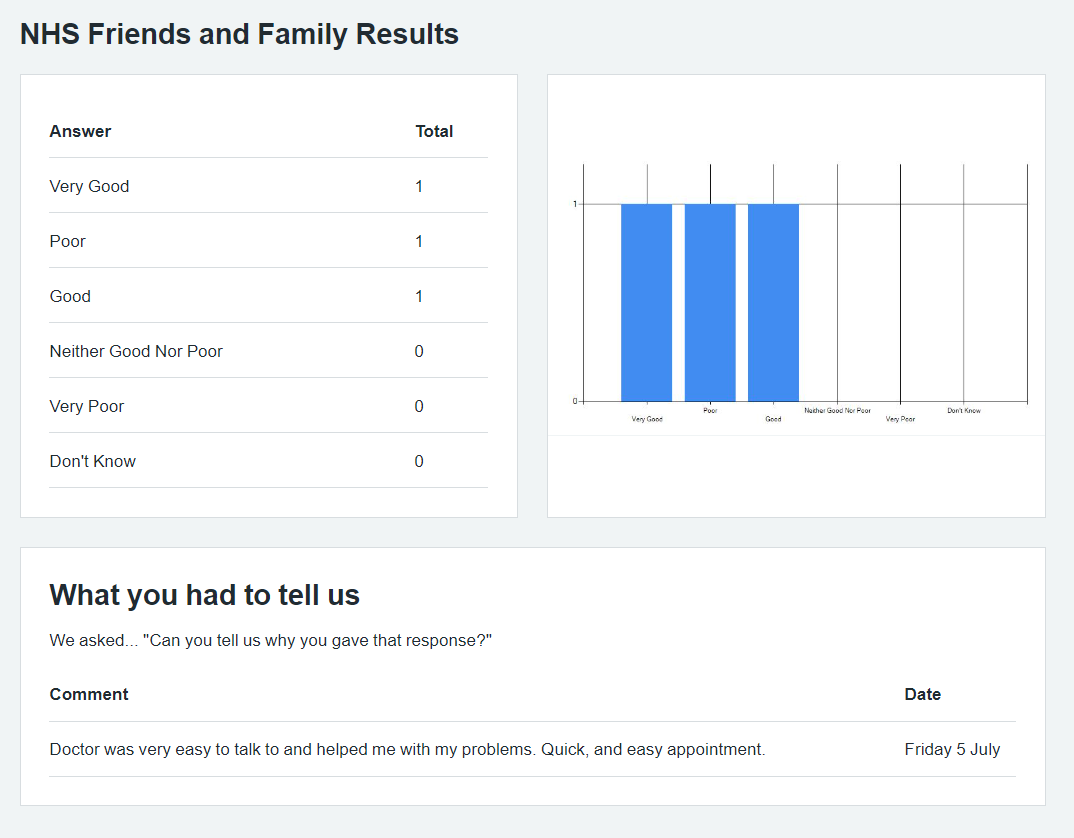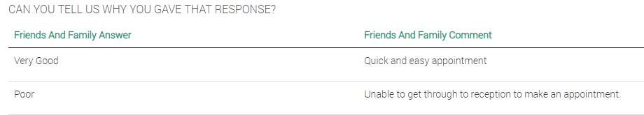 - Publish Responses - Adds a 'View results here' button to the FFT widget. This will lead to a page that shows a bar graph and a table of the number of responses, as well as comments that you have chosen to publish. E.g. of how publish responses shows on the website