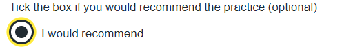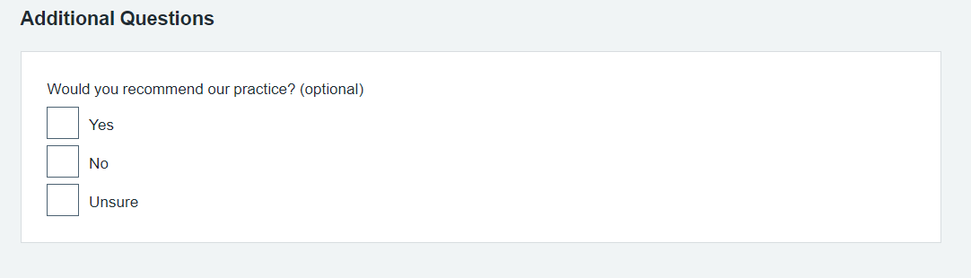 - One Answer - The question will have one tick box that patients can use. Question example: