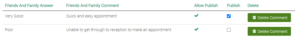 2) Tick the Publish box for the comments you would like to show on the website. This can only be done if the patient has ticked the box to allow publishing of the comment.