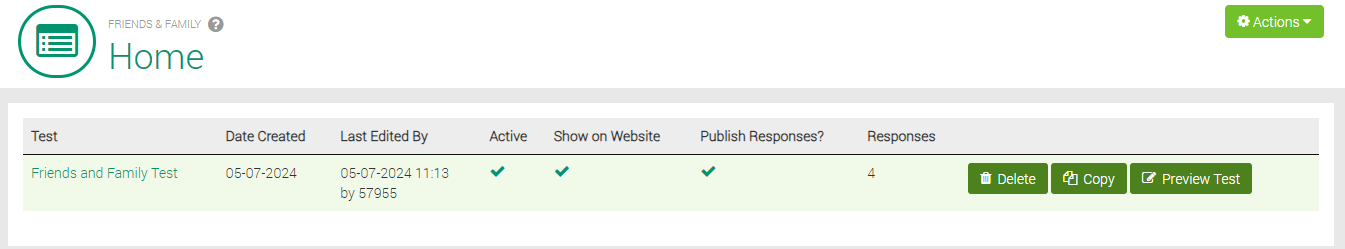 1) Click on the Friends and Family Test name under 'Test' and choose 'View Responses' in the top right
