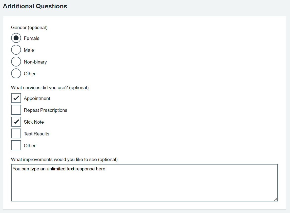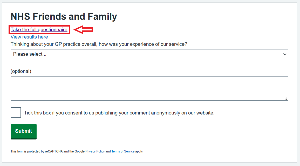 Please note for patients to view the additional questions they will need to click on the 'Take the full questionnaire' link to answer them within the FFT Widget. All additional questions added will be marked as optional.