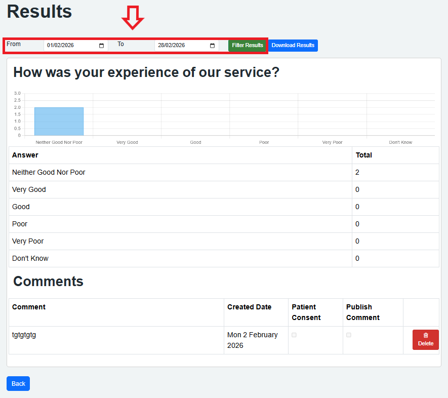 3) This page will show a bar graph of the response, the overall number of responses by answer and any comments left. The page will show the current month's responses by default. To change the timeframe of data you are viewing you can change the 'From' and 'To' date at the top of the page and choose 'Filter Results' to update the data to the new timeframe.