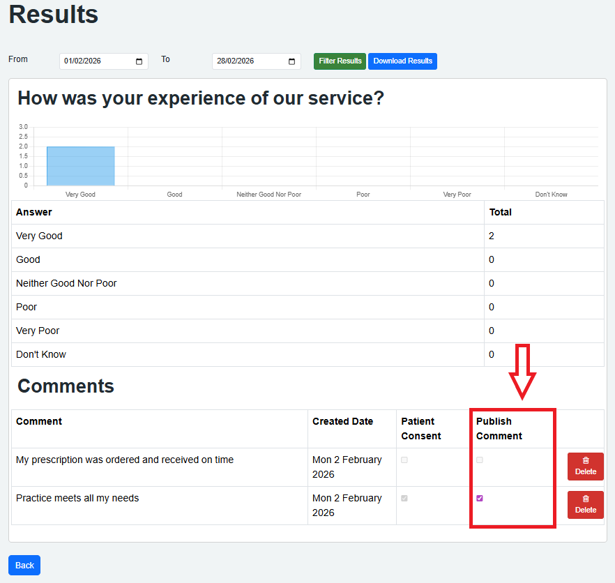 3) Within the Comments section there will be a column for 'Publish Comment'. You can tick the boxes for the comments you'd like displayed on the website. Please note you will only be able to tick the box in the Publish Comment column if the patient has given consent for their comment to be published when submitting their FFT response. This can be seen within the Patient Consent column.