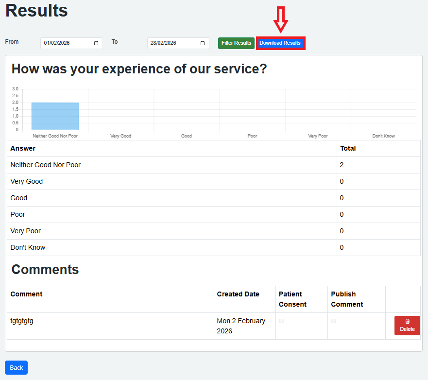 If a comment contains sensitive patient data or needs to be removed for any reason, you can click the trashcan icon next to the comment within the FFT Results page. This will not remove the associated 'How was your experience of our service?' answer.