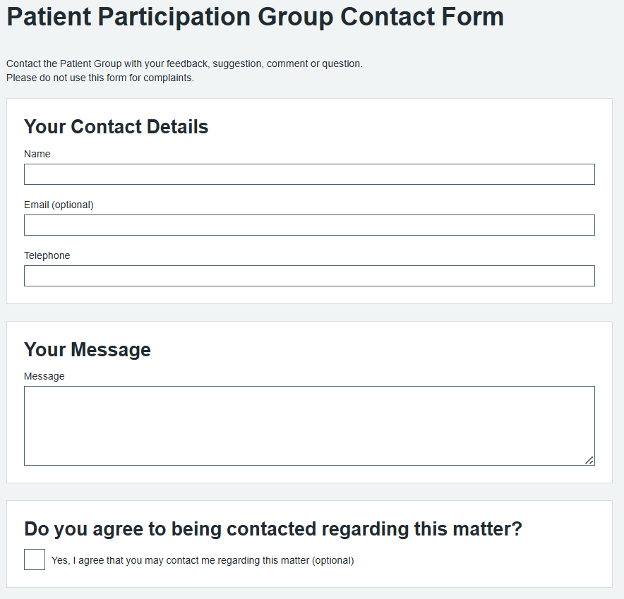 Patients can click this to be taken to the Patient Participation Group Sign Up form. Patients will have the following options to fill out: