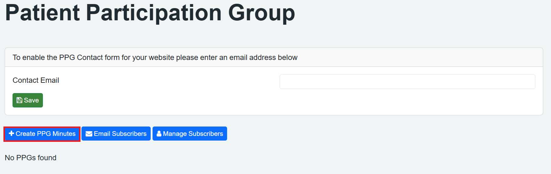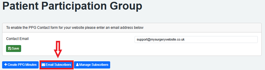 Once you have entered an email and clicked 'Save', the 'Contact the PPG' button will show on the PPG page of the website: