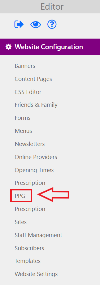 To add the 'Contact the PPG' button you will first need to navigate to the PPG option within the editor menu: