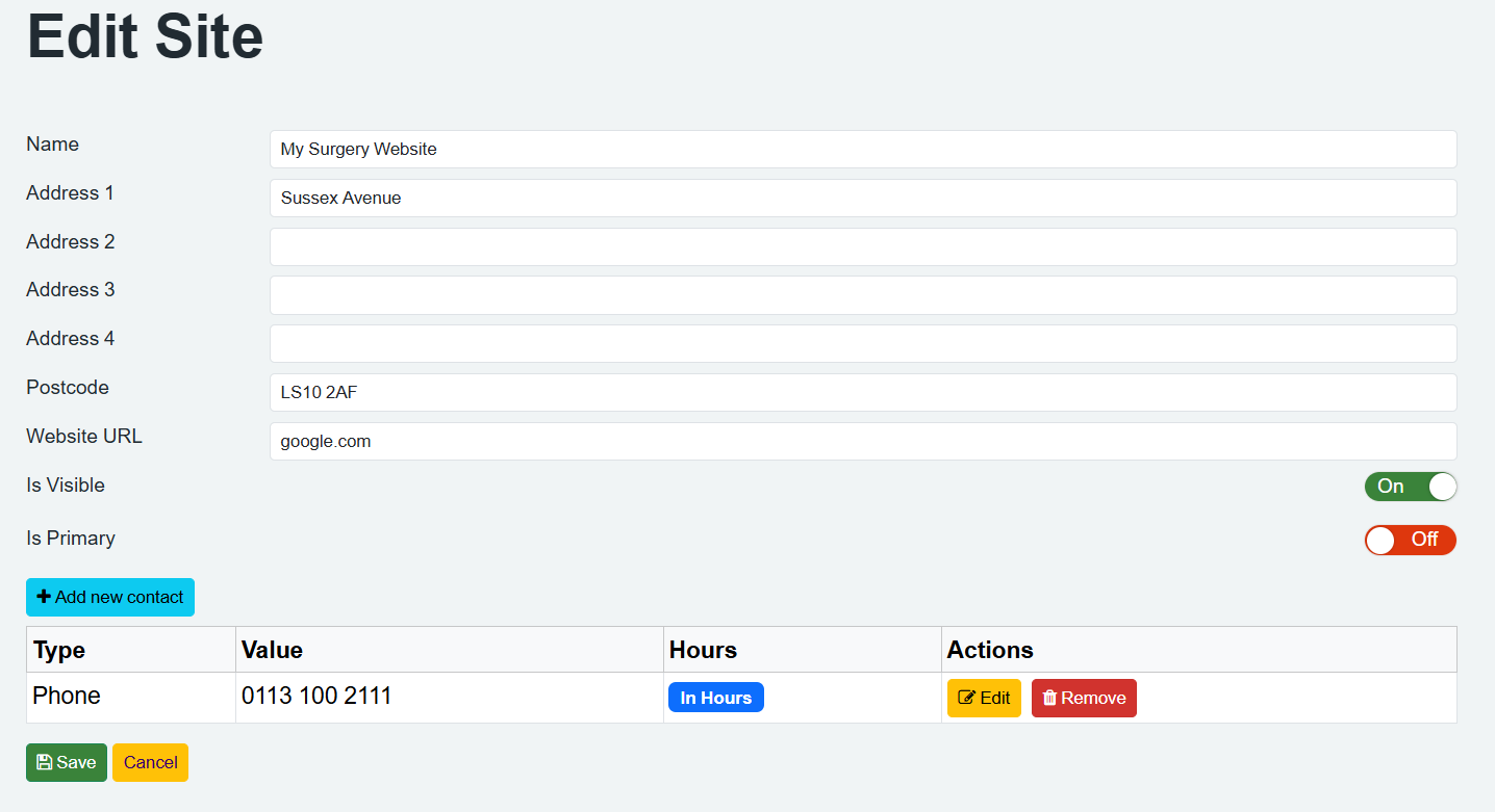 - Under the actions column on the right will be an 'Edit' button. You will need to click the edit button next to the contact option you would like to update. Either update the phone number or email address and then click save within both the 'Edit Contact' section and then at the bottom of the 'Edit Site' page.