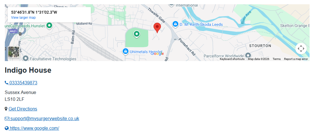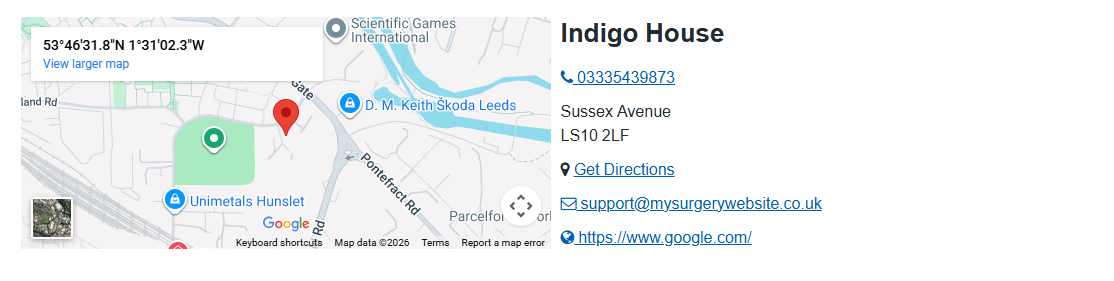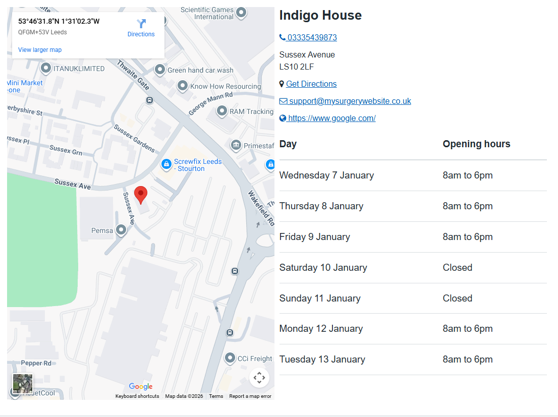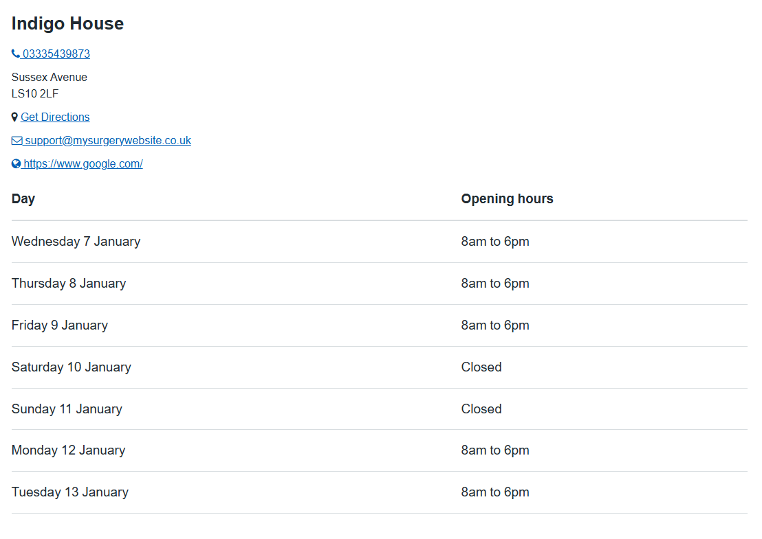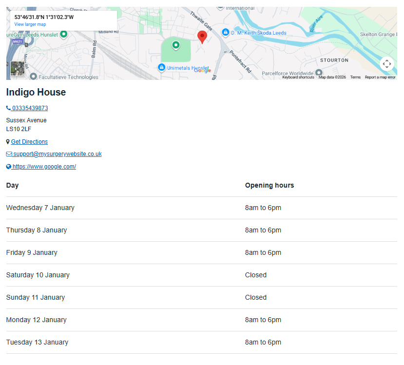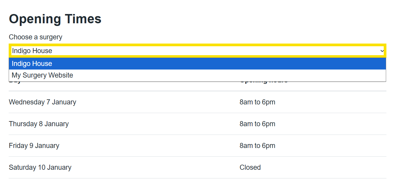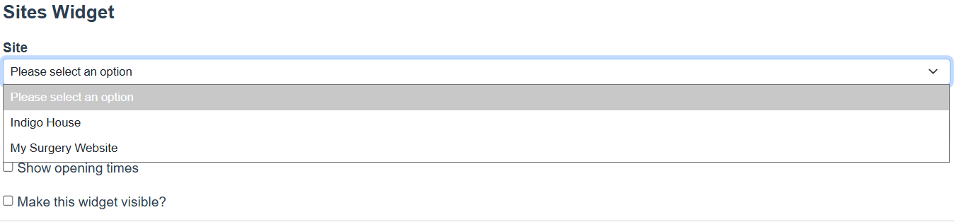 When adding an Opening Times widget, patients will be able to choose which of the sites they'd like to see the opening hours for from a drop down menu.