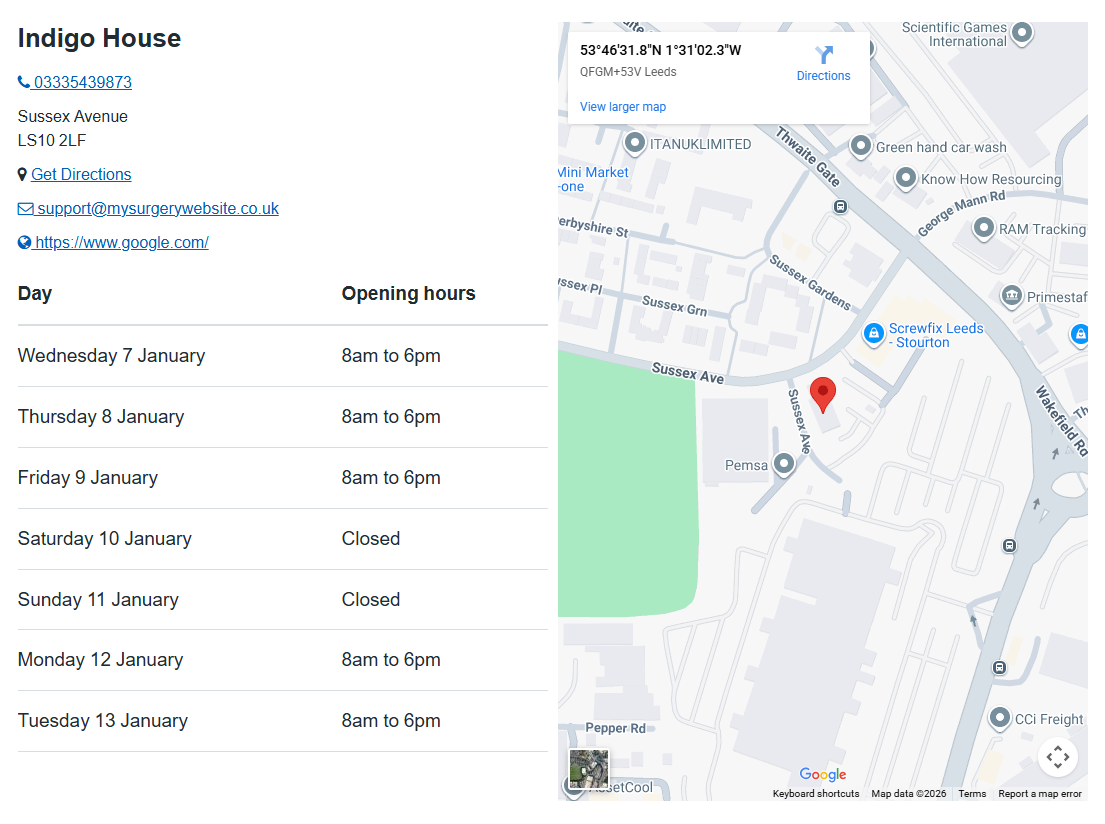The site widget has a number of ways in which it can be displayed including the location of the map within the widget. Each map location can be displayed with or without the opening times visible.