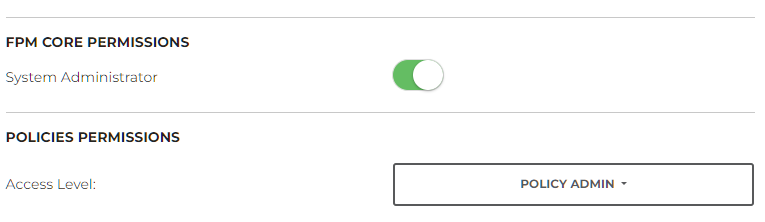 If you would like a staff member to be responsible for managing user access and policy ownership, you would set the user to have System Administrator access and set the Policies Permissions access to Policy Admin as seen below: