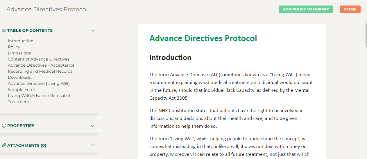 The preview window shows you the document content, the "Table of Contents", "Properties" such as “Owner”, “Last Published”, and “Review Date”. Selected policies have an "Attachments" drop-down as seen below:
