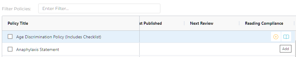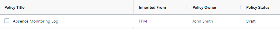 In the example above, the "Absence Monitoring Log" policy is a policy that I would like to add to my library, but I can see that it is not in my library as its Policy Status is currently Not in Use.