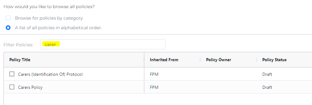 If you were specifically looking for a policy on "Carers", simply enter Carer into the Filter Policies search box and you will see any relevant results: