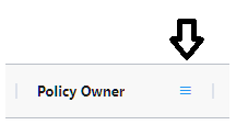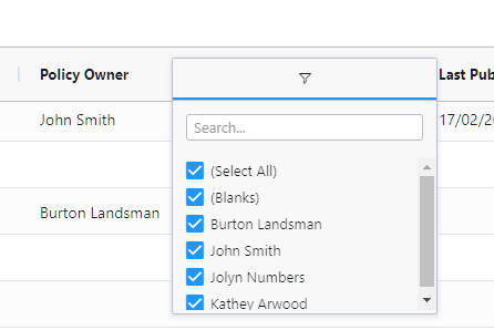 You can also filter a specific column, by hovering over a Column Title and pressing the 3 lines that show. For example, if I wanted to filter Policy Owners, I can press on the 3 icons, and it will allow me to filter the view to a specific policy owner:
