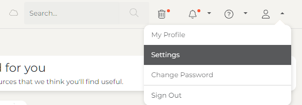 To modify notification settings, select your Profile icon in the top-right and Settings from the drop-down: